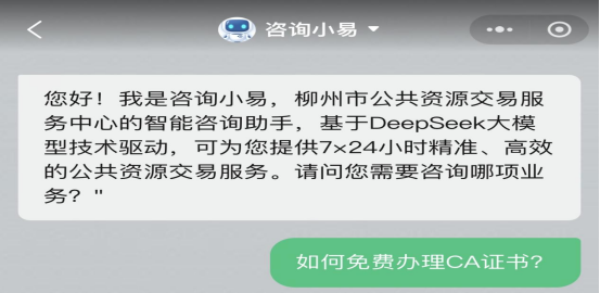 亲爱的各方交易主体,为了让大家能够更加便捷地获取柳州市公共资源交易相关的信息和服务,柳州市公共资源交易服务中心现已全面接入咨询小易DeepSeek-满血版。接下来,就让我们一起了解一下如何使用这项服务吧!