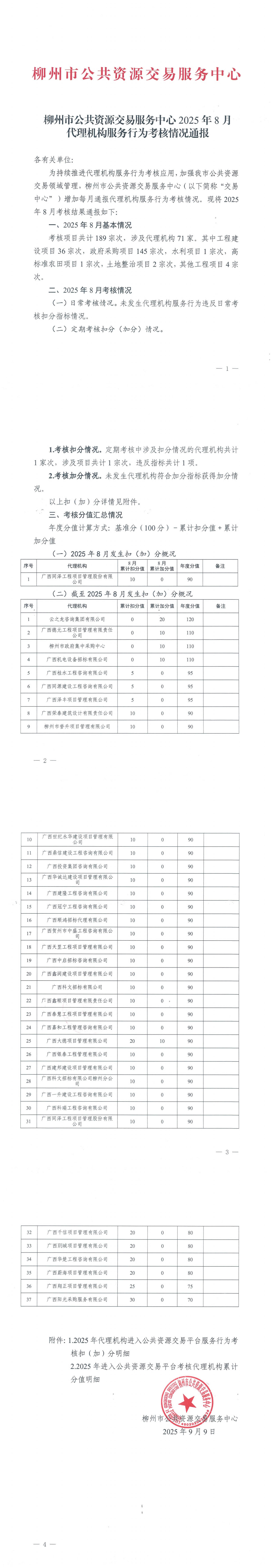 柳州市公共资源交易服务中心2025年8月代理机构服务行为考核情况通报