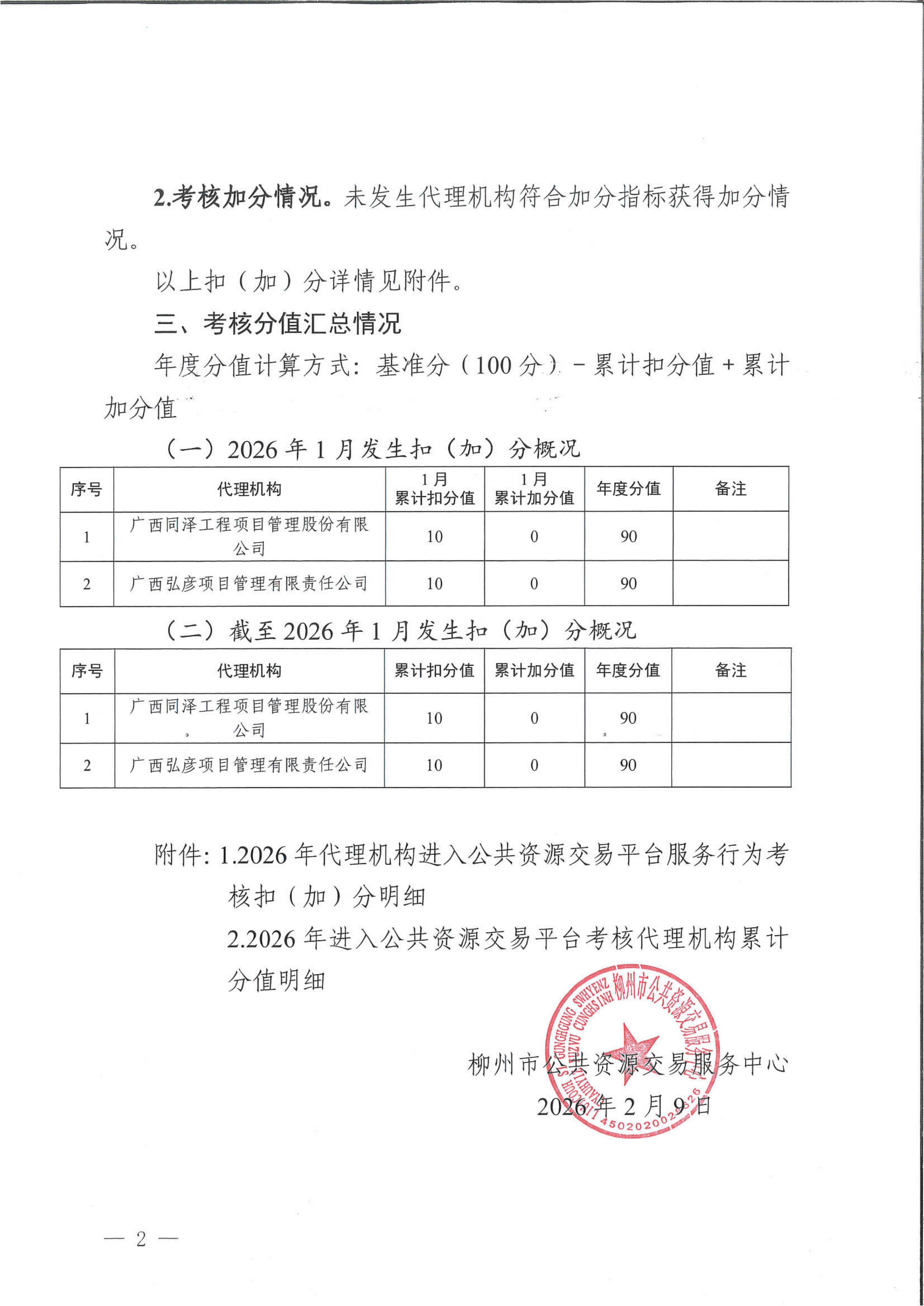 柳州市公共资源交易服务中心2026年1月代理机构服务行为考核情况通报