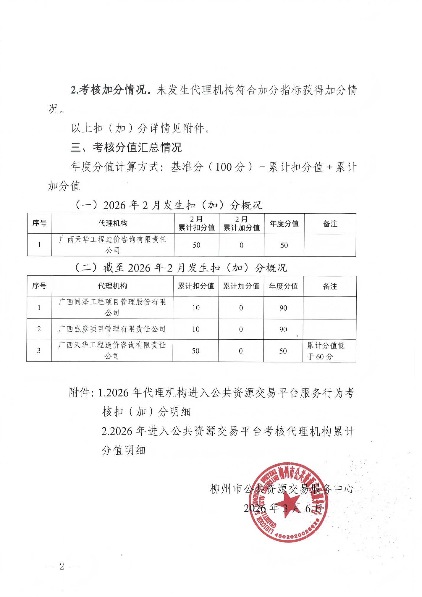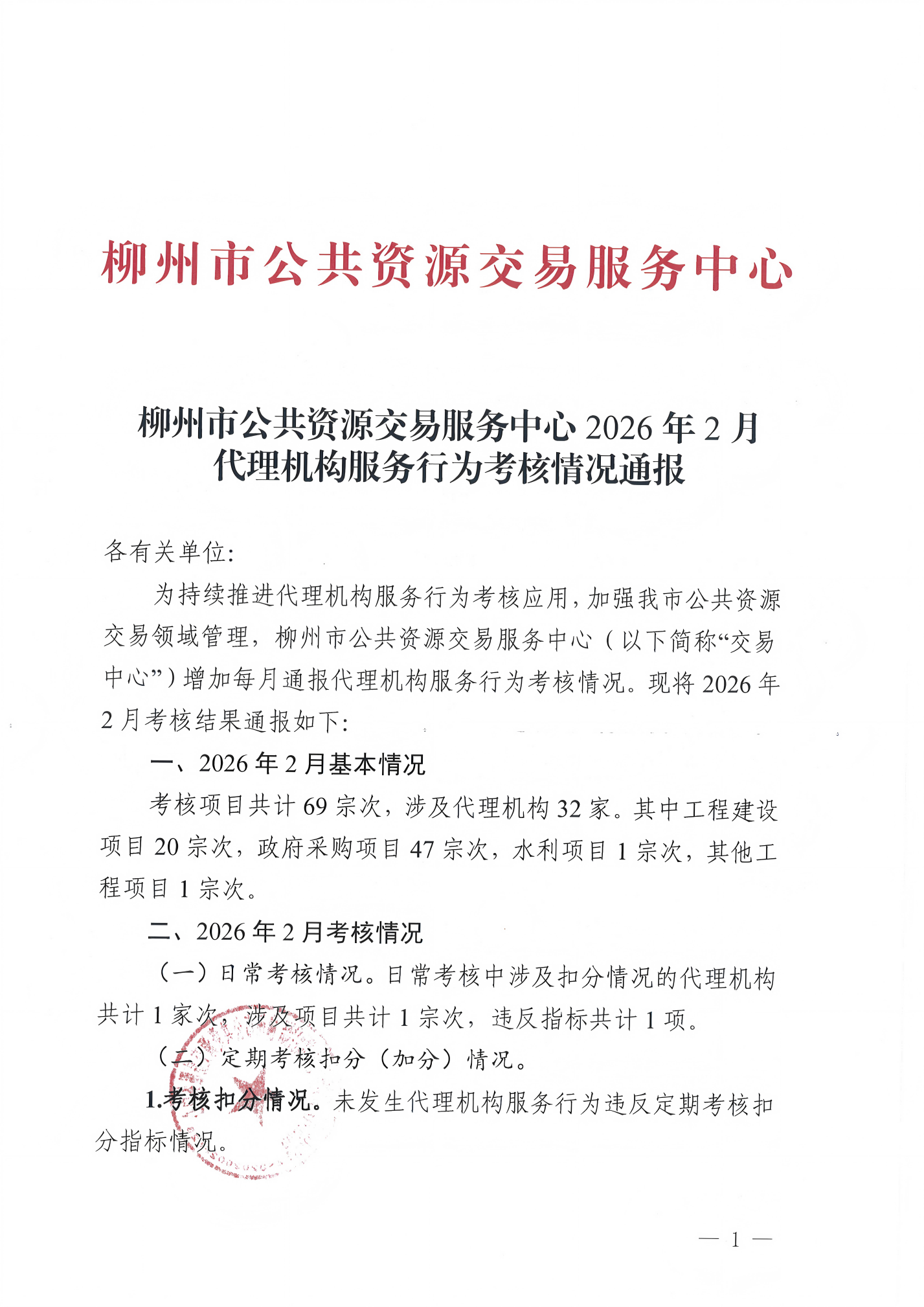 柳州市公共资源交易服务中心2026年2月代理机构服务行为考核情况通报