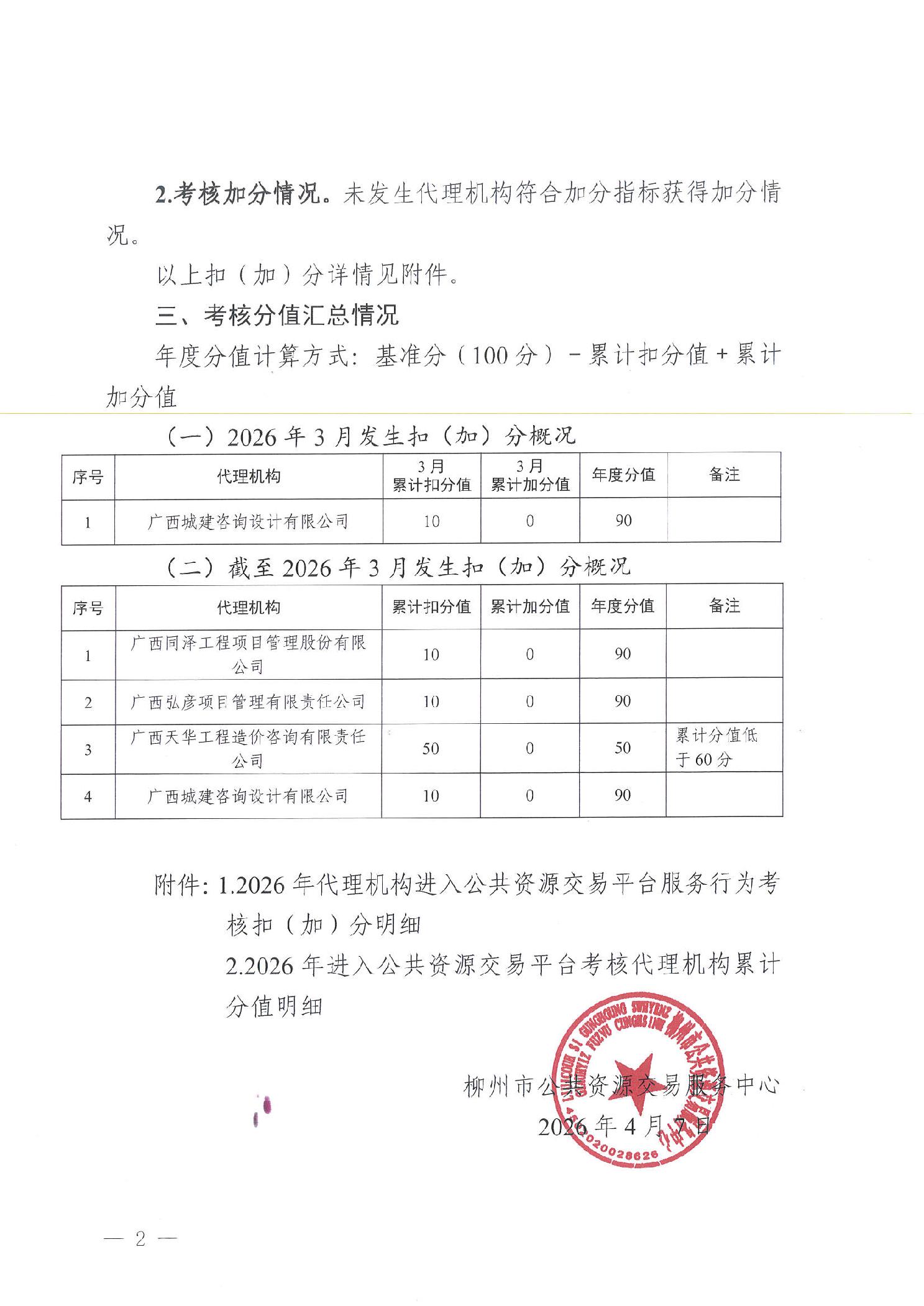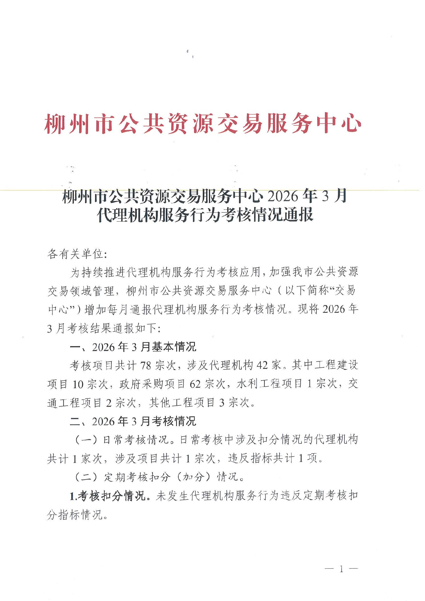 柳州市公共资源交易服务中心2026年3月代理机构服务行为考核情况通报